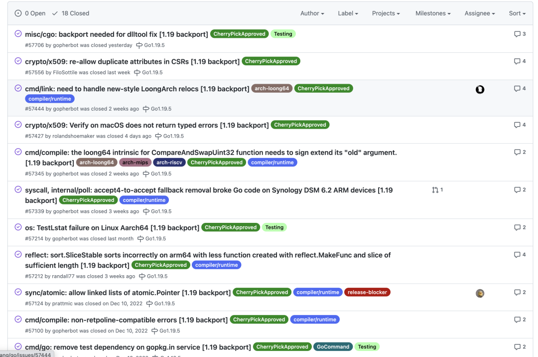 昨天,Go 官方发布了 Go1.19.5,同步发布的还有 Go1.18.10,这是两个小版本,主要涉及安全更新,具体包括编译器、链接器以及 crypto/x509, net/http, sync/atomic, 和 syscall 等包的 bug 修复,一个 fix 了 18 个 issues。https://github.com/golang/go/issues?q=milestone%3AGo1.19.5+label%3ACherryPickApproved