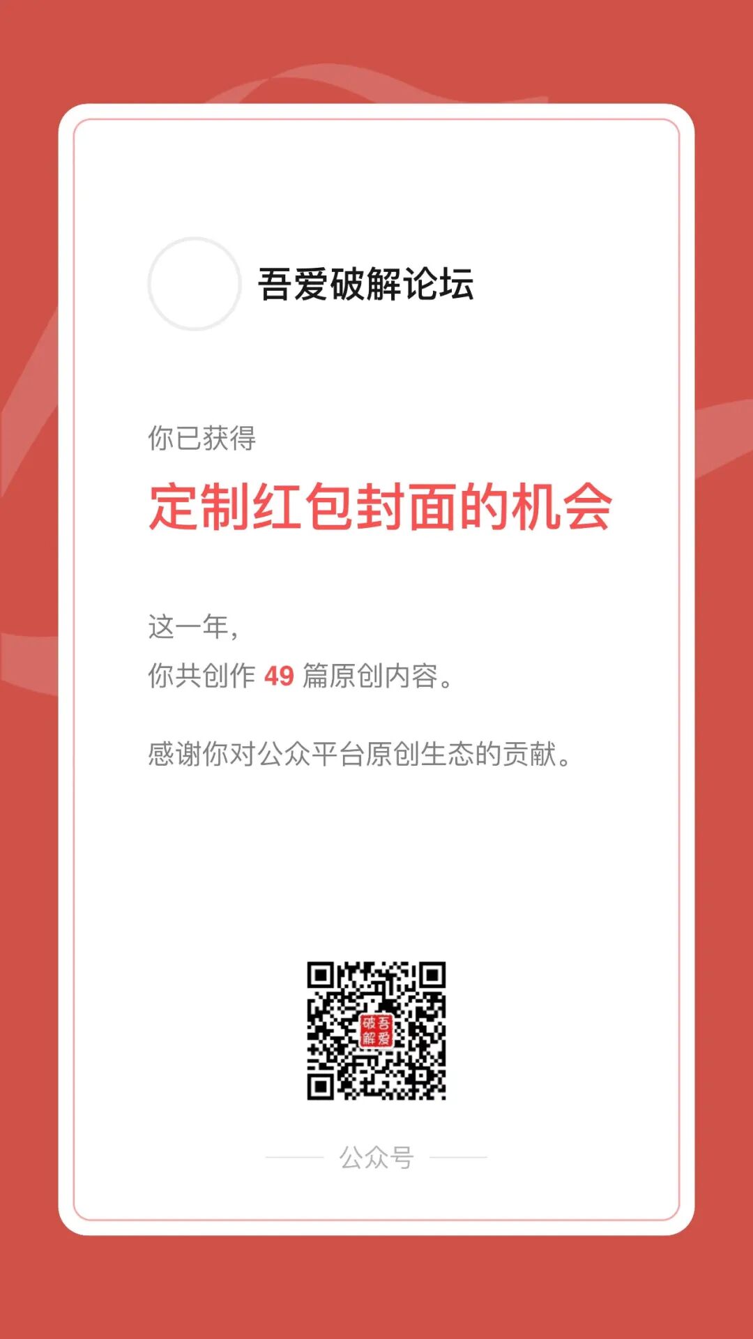 收到微信公众号平台的感谢,这里要感谢论坛的原创作者们,内容主要来源于他们。并给免费我们提供了10万个的红包封面。所以现在来向大家征集论坛红包界面啦,到时候通过公众号给大家发放领取,届时会把制作者信息一