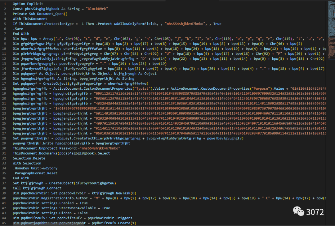 为了搞清楚该dll启动的方式和启动路径,需要先获取上一阶段word文档中的VB宏。