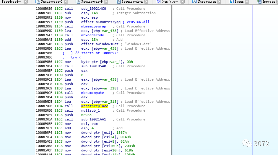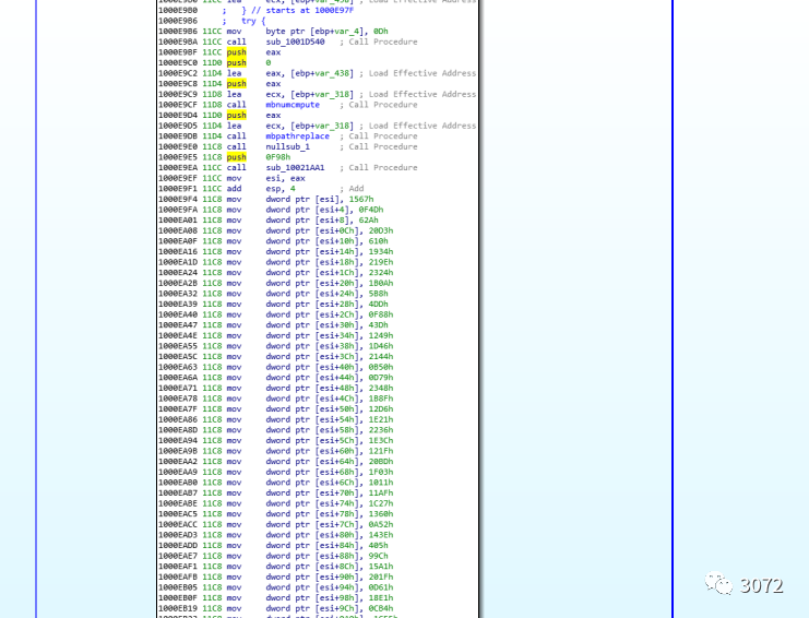 二进制代码中有大量的mov操作,以及利用try catch的混淆手段扰乱着代码块,静态看起来比较复杂。