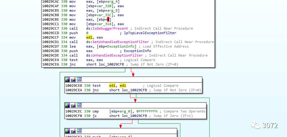 由于前面动态调试的时候一直报异常,第一反应是有反调试,也的确发现了反调试API。,但下断点后发现在反调试之前就已经异常了。