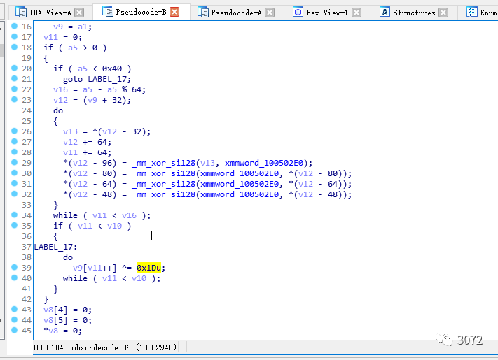从IDA中发现有一些加密的字符串,并且加密字符串后续的操作疑是解密过程