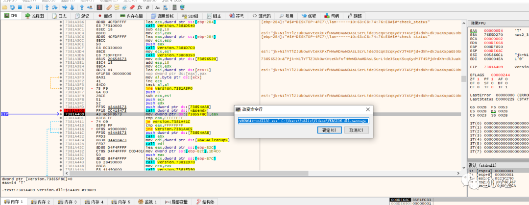 往上找找有一个send操作,为了方便查看流量特征,现在得想办法让dll正常跑起来,并在send下断点,查看buf的值。