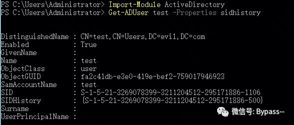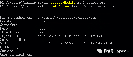 PS C:\Users\Administrator> Import-Module ActiveDirectoryPS C:\Users\Administrator> Get-ADUser test -Properties sidhistory