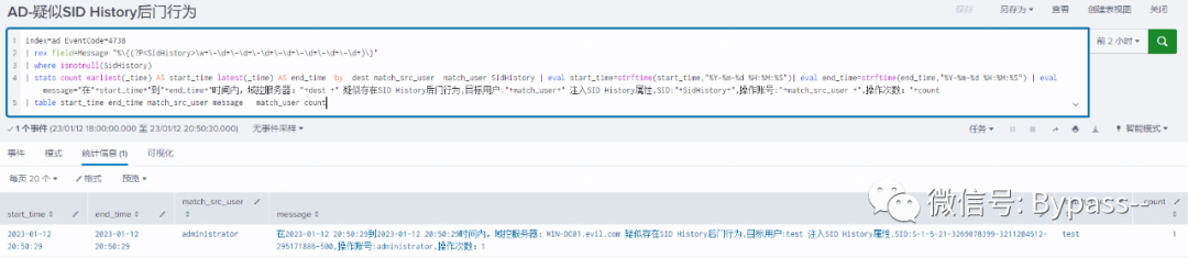 当攻击者将 SID Histtory属性添加到用户,用户对象发生更改产生4738事件,通过监视SidHistory属性的值,从而找到可疑的SID History后门行为。
