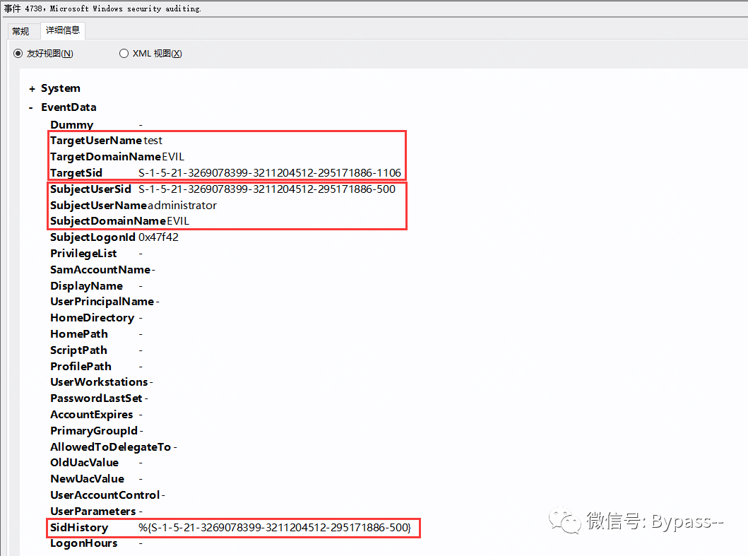 4738事件:每次更改用户对象时,都会生成此事件,包含使用帐户和目标帐户以及Sid History属性的值。
