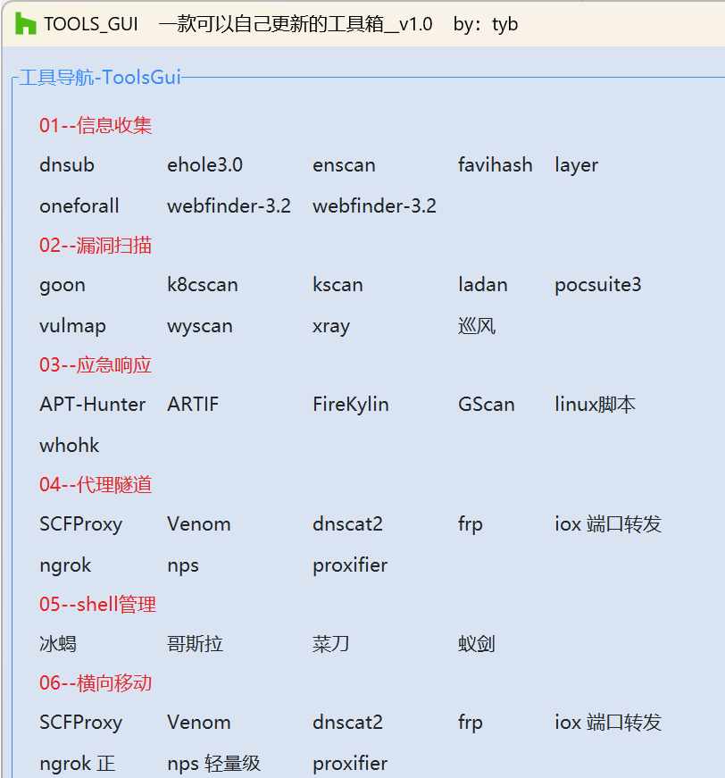 pip install -r requirements.txt3、在FreeGui_v2.1_win的同级目录下创建自己想要的工具分类目录(带有“--”标识),例如:01--信息收集