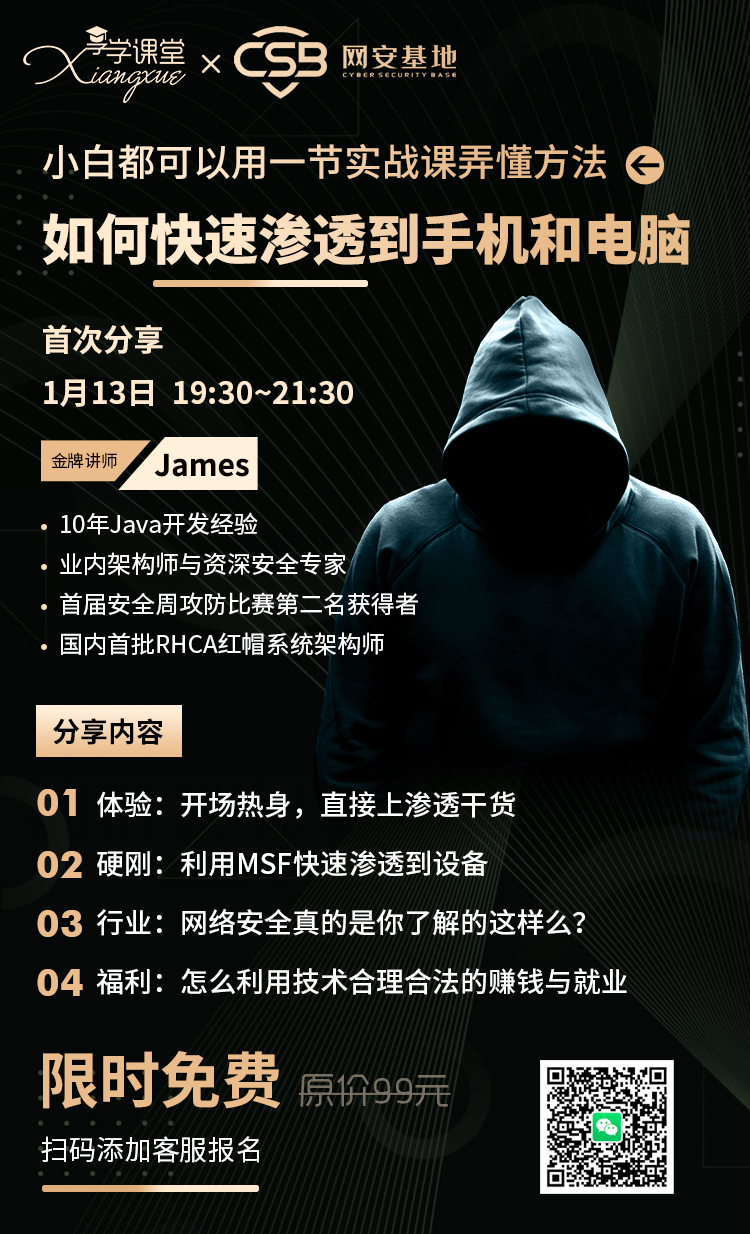 为了帮助早日进阶成为一名黑客,笔者特邀阿里云首席网络安全专家James老师为大家带来《如何快速渗透到手机和电脑》系列直播课程