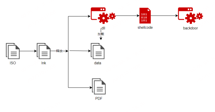 近日,360威胁情报中心的安全研究人员监测到一起疑似具有朝鲜背景的APT组织APT-C-26(Lazarus)以加密货币钱包推广信息为主题投递恶意ISO文件的攻击事件。攻击者在ISO文件内打包了一个恶意快捷方式(.lnk)文件,当受害者打开该快捷方式文件时会调用powershell.exe进程从自身文件中查找数据释放3个文件(诱饵PDF、加载器DLL、密文文件),并执行其中的恶意DLL文件。DLL加载器会解密和释放出最终的后门程序。,根据研究人员分析,发现该后门程序与此前披露的NukeSped家族后门一样,习惯使用硬编码存储C&C服务器地址和端口信息,并且习惯在代码中引用随机数,同时其标志性的后门指令也与NukeSped家族后门高度相似。因此,研究人员怀疑该后门程序为Lazarus组织的NukeSped家族后门的变种。攻击链图如下图所示。