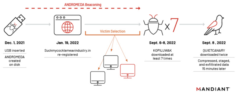近日,Mandiant的研究人员称,在最近一次针对乌克兰的攻击中,发现了具有俄罗斯背景的APT组织Turla利用了其他黑客组织遗留的Andromeda恶意软件。Andromeda也被称为Wauchos或Gamarue,至少从2011年9月开始活跃,可将受感染的机器加入到僵尸网络中,已被广泛用于凭据窃取和恶意软件传播等攻击活动。自2022年2月俄乌冲突以来,研究人员多次发现Turla组织与一系列针对乌克兰的钓鱼式凭据窃取攻击和网络侦察活动有关。根据研究人员分析,本次攻击活动于2022年9月进行,但遭遇攻击的乌克兰组织此前于2021年12月便被其它攻击者通过受感染的USB驱动器植入了Andromeda恶意软件。Turla近期再次利用该恶意软件分发侦察工具KOPILUWAK和后门木马QUIETCANARY。此外,研究人员还发现,至少有三个过期的Andromeda的C2域已被Turla重新注册并继续用于监控受害者。攻击链图如下图所示。