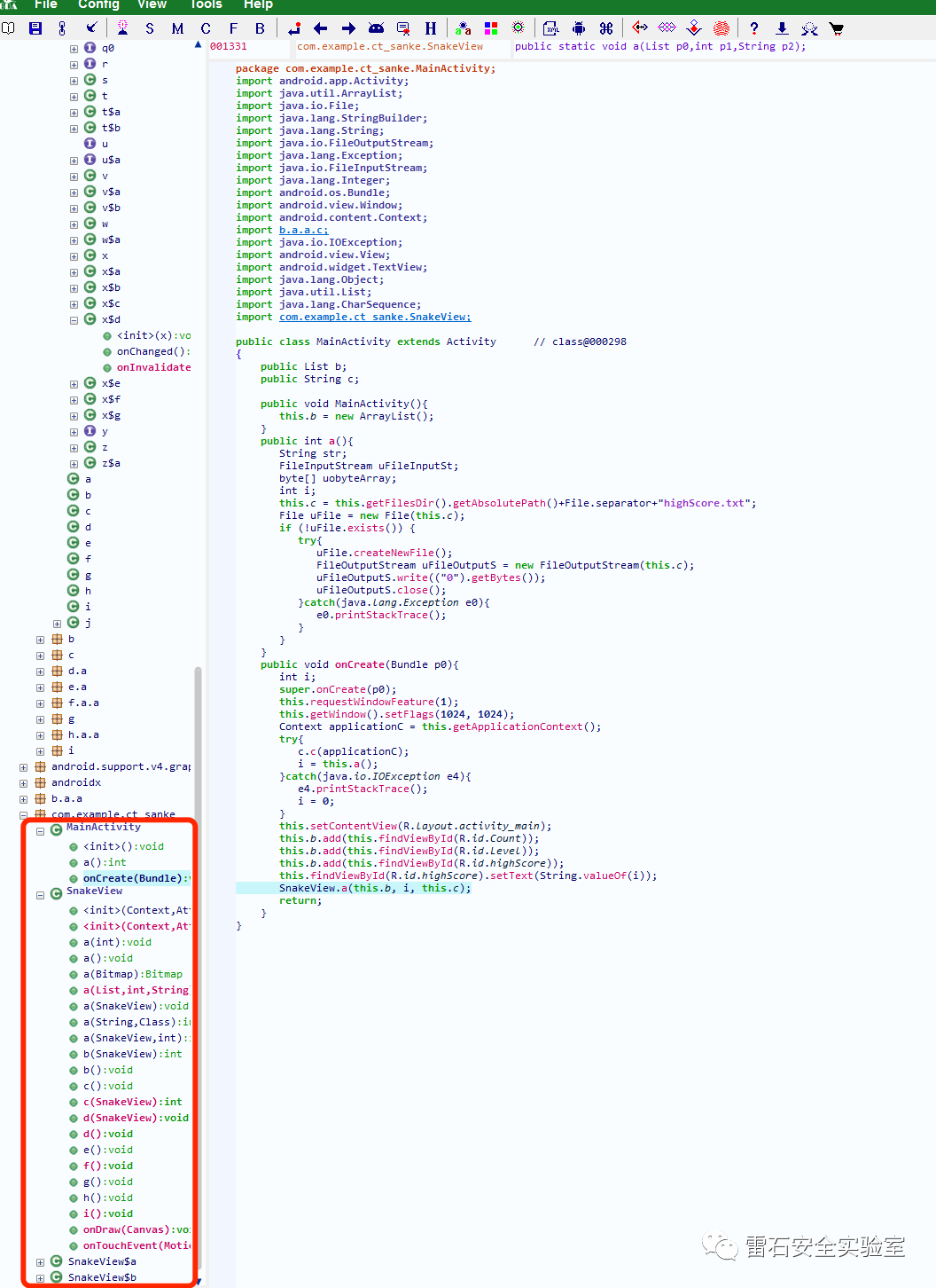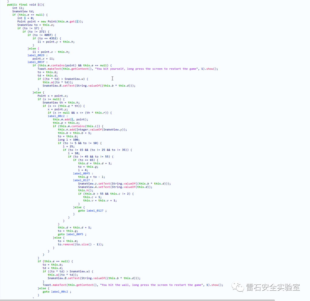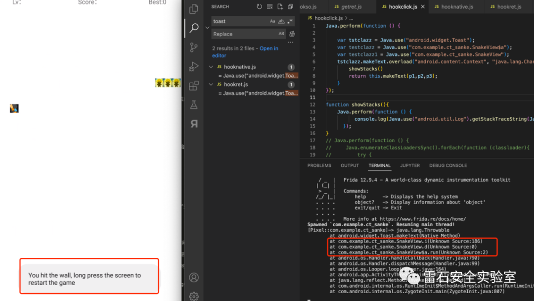 涉及的就是snakeView,直接看代码有点费时费力,发现这个游戏你撞墙或者撞到自己,会提示要求重来,这里有个弹框,我习惯直接hook打印调用堆栈,用来定位(当然这里不这样直接找也能找到)。