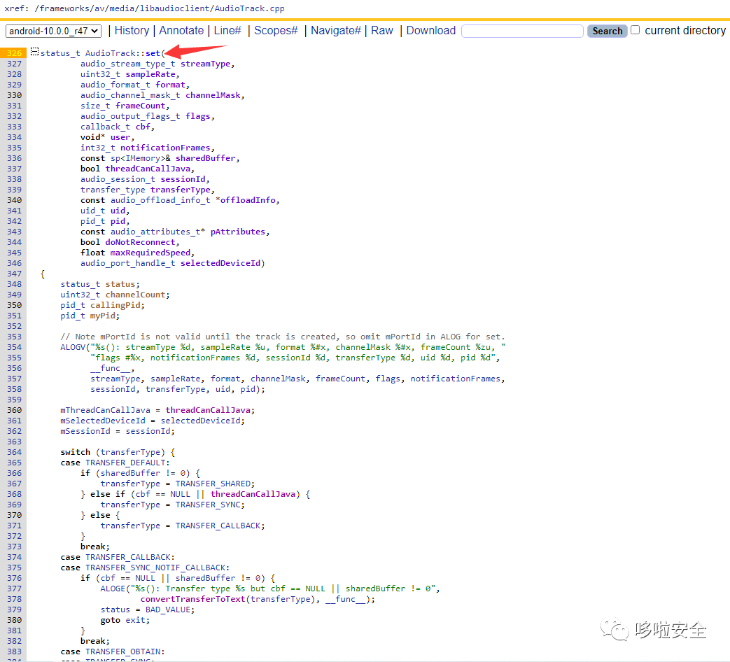 /frameworks/av/media/libaudioclient/AudioTrack.cpp326 status_t AudioTrack::set(327 audio_stream_type_t streamType,328 uint32_t sampleRate,329 audio_format_t format,330 audio_channel_mask_t channelMask,331 size_t frameCount,332 audio_output_flags_t flags,333 callback_t cbf,334 void* user,335 int32_t notificationFrames,336 const sp<IMemory>& sharedBuffer,337 bool threadCanCallJava,338 audio_session_t sessionId,339 transfer_type transferType,340 const audio_offload_info_t *offloadInfo,341 uid_t uid,342 pid_t pid,343 const audio_attributes_t* pAttributes,344 bool doNotReconnect,345 float maxRequiredSpeed,346 audio_port_handle_t selectedDeviceId)