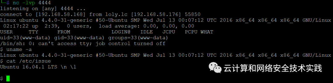 kali攻击机上开个反弹shell监听,nc -lvp 4444,