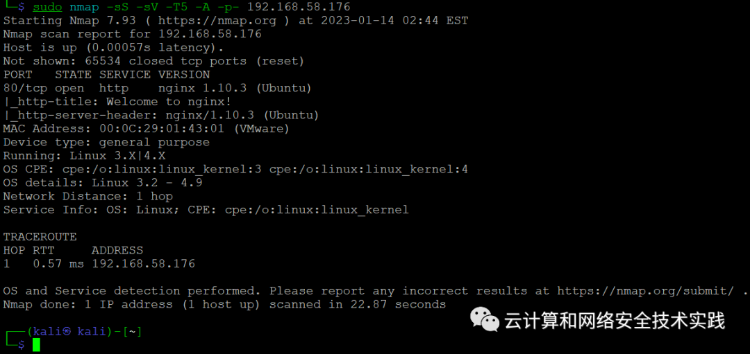继续做端口扫描,sudo nmap -sS -sV -T5 -A -p- 192.168.58.176,