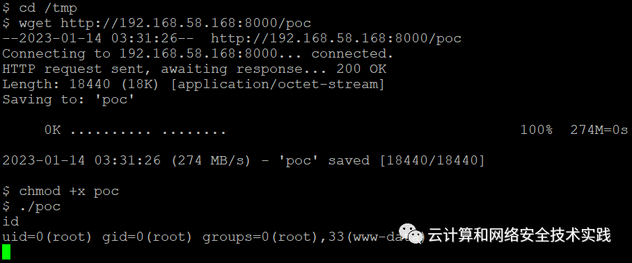 把编译好的poc文件搞到靶机上,执行,chmod +x poc,./poc,