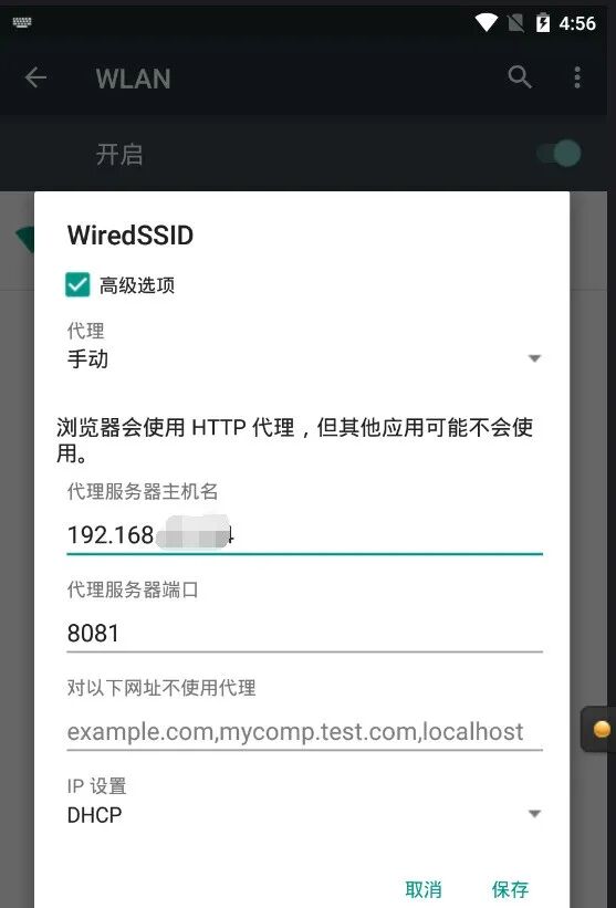 3、点击手动,然后配置电脑的ip,和代理端口,保存退出。