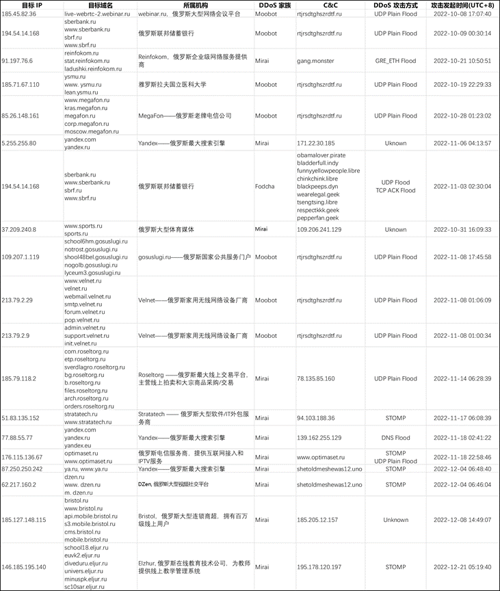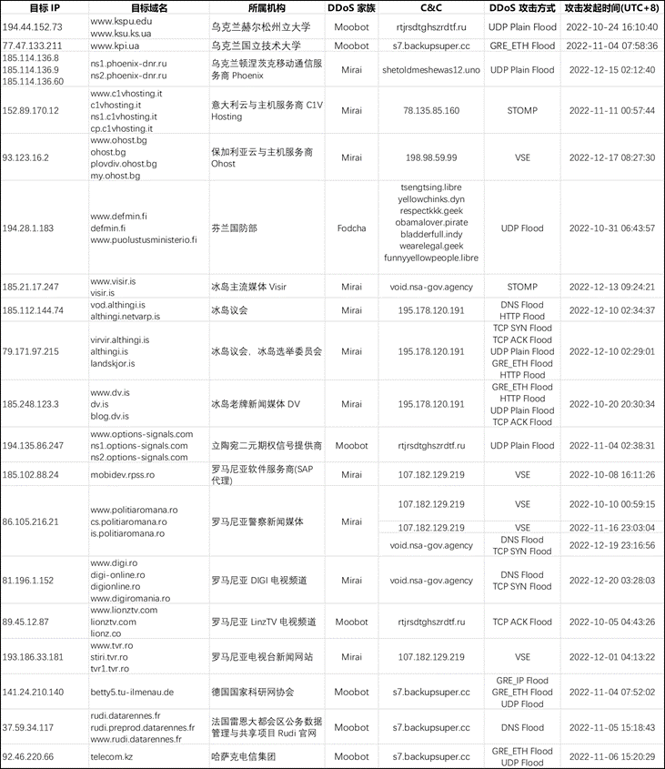 俄乌冲突开始以来,物理战争如火如荼,目前虽已陷入僵持状态,但网络世界的对抗持续进行。其中以乌方组织 The IT Army of Ukraine 和俄方组织 KillNet 最具实力和代表性,同行曝光的 NoName057(16) 和 DDosia 也是其中的新势力,夹杂着其他大大小小的组织,双方阵营在网络世界以 DDoS 攻击为武器,展开了多次较量。奇安信威胁情报中心对全球范围的 DDoS 攻击活动也进行了长期监测,本文整理一下 2022 年第四季度我们看到的俄乌双方阵营针对重要目标的攻击活动,并对个别案例进行深入分析。我们对 2022 年第四季度中俄乌双方的 DDoS 攻击事件分别做了统计,其中一部分针对俄方重点目标的 DDoS 攻击活动列表如下:针对乌方阵营多个国家的重点目标 DDoS 攻击活动如下: