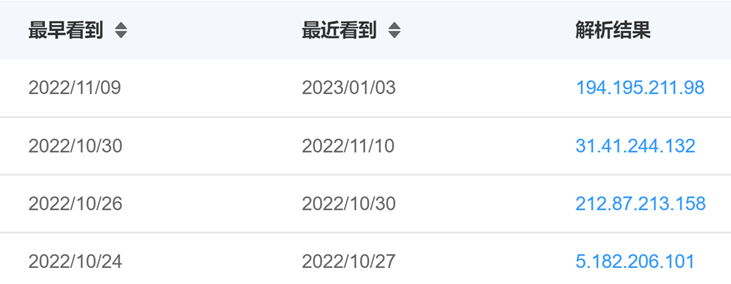 同一个 C&C 既攻击过俄方目标,也攻击过乌方阵营的目标,一般这种 C&C 背后都是 DDoS 攻击平台,提供 DDoS 攻击租赁服务。另外,也可以看到,掺杂多种 DDoS 攻击方式的混合攻击也很多,理论上这样可以提高 DDoS 攻击的成功率,增加受害目标的防护成本。在关注俄乌冲突背景下的僵尸网络和 DDoS 攻击活动的过程中,我们注意到一个可疑的 Moobot 家族僵尸网络,其 C&C 域名为 s7.backupsuper.cc。这个僵尸网络有以下特点:据此我们有理由怀疑它背后的控制者可能是亲俄人员或组织。根据我们的威胁情报数据,backupsuper.cc 域名注册于 2022-10-03,而 s7.backupsuper.cc 启用于 2022-10-24,迄今共解析过 4 个 IP:另根据我们的 PassiveDNS 数据,该 C&C 域名上线后即发起了一大波传播,域名的访问立即有了一波高峰,后面略有起伏,但访问量总体趋于下降。这说明最初该家族的样本确实控制了大量设备,而随后由于各种原因,该家族控制的失陷设备数量渐渐减少: