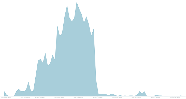 我们的未知威胁监控系统的监测数据显示,该僵尸网络样本最早通过 CVE-2016-6563 漏洞传播,立即感染了大批设备,后面样本中加上了 CVE-2017-17215 漏洞利用开启了蠕虫式传播。这样该僵尸网络就以固定 IP 的扫描器利用漏洞和蠕虫式传播两种方式结合传播,但根据我们的 PassiveDNS 数据显示,后期可能并未感染太多设备。该僵尸网络的恶意样本的传播高峰期在 2022.10.30——2022.11.13 期间,总体趋势如下: