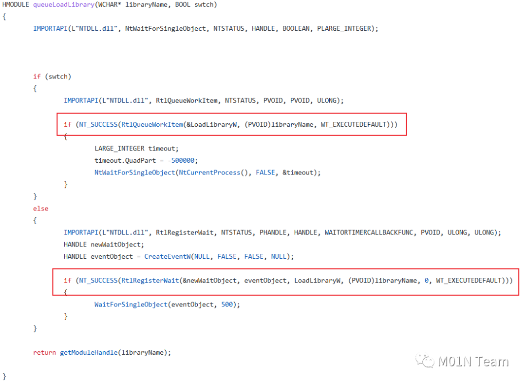 以Nighthawk和BruteRatel为代表的新C2扩展了这种滥用方式,这两个C2框架分别使用RtlQueueWorkItem和RtlRegisterWait来代理执行LoadLibrary,以用来绕过AV/EDR对敏感调用检查(安全产品常常会进行回溯检查类似LoadLibrary的敏感API是不是来自于可疑的调用)。