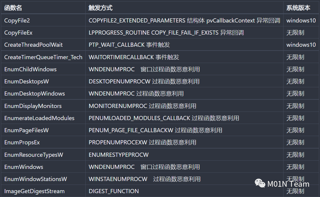在去年我们就观察到WinAPI的滥用情况,AlternativeShellcodeExec项目详细收集可被滥用的WinAPI, 这些WinAPI主要可以被代替作为运行shellcode的函数。