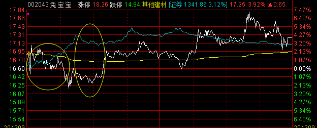 开盘后证券指数不断上涨加强时,题材特征的兔宝宝持续回落,而当证券指数拉高后回落时,兔宝宝恰好逆势上涨。