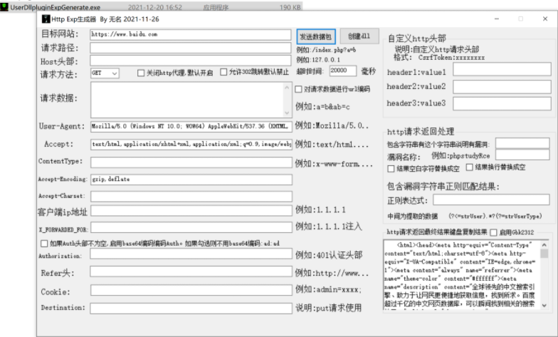 一键生成dll,Dllplugins.dll 是内置dll不要尝试加载。对于批量dll话在软件目录添加一个dll目录即可进行批量。其他和内置exp操作一样。注意一键生成dll软件除post数据框那里可以有带双引号的数据。其他所有地方都不允许有双引号否则会编译失败!!!使用如下图: