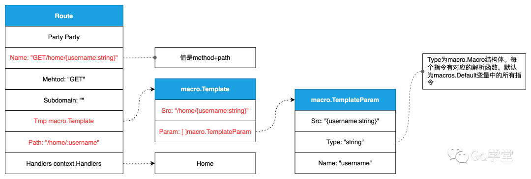 从router.APIBuilder结构体及其相关的reporitory和Route结构体可以看到,这里包含了路由的相关信息。例如,在repository中的routes字段,代表所有的路由,可以简单理解为一个简易的路由表。在Route结构体中包含了请求方法Method字段、请求路径字段Path、对应的请求处理函数Handlers字段。其中还有macro.Template类型的Tmp字段是针对正则路由的正则表达式。