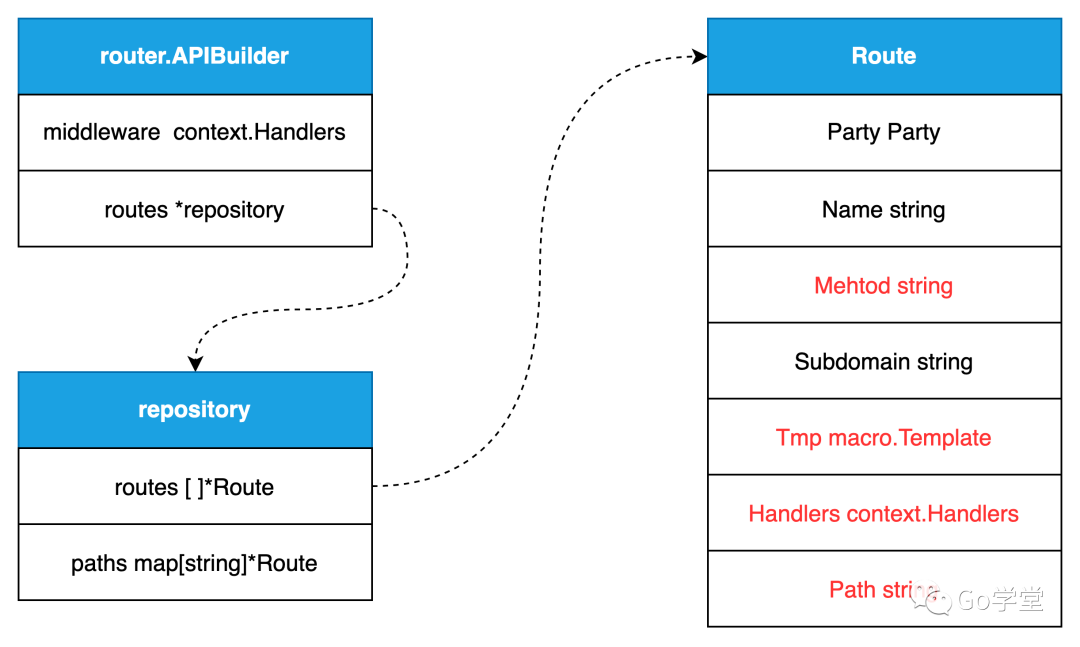 如下是router.APIBuilder结构体的主要字段及其相关联的结构体: