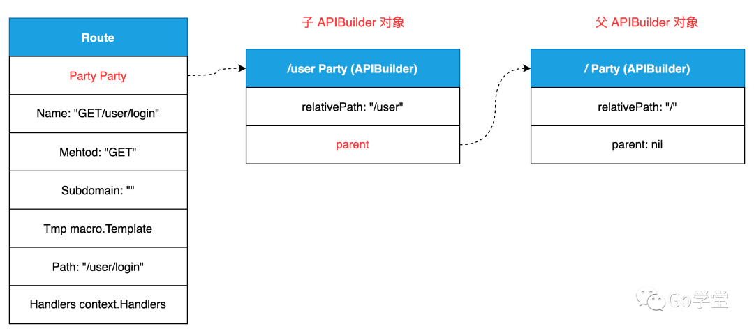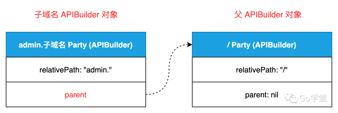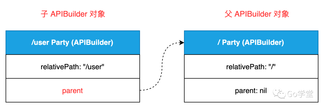这里通过使用app.Party方法对路由进行了分组。在上文咱们说过,Party方法实际上返回的是一个APIBuilder对象。大家还记得吗,app里也是嵌套了APIBuilder结构的,那么app.Party实际上是给app中的APIBuilder创建了一个子APIBuilder对象,同时给子APIBuilder中的relativePath设置成了 "/user"。也就是通过该子APIBuilder对象注册的路由,路径都是相对于relativePath的,即 "/user"设置的。如下是APIBuilder中的父子关系: