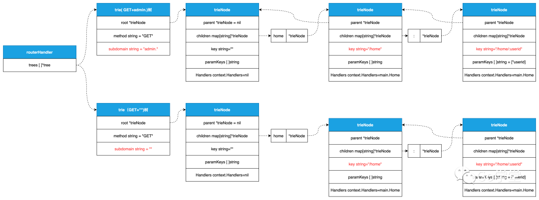 根据上面刚分析过的,请求方法method和子域名subdomain两者唯一确定一棵树。即同样method和同样的subdomain的路由在同一棵树下。所以,上面的路由就有两棵树:Get方法+空子域名和Get方法+admin子域名。同时我们看到,在每一棵树中都有共同的前缀/home,所以会形成home->{userid:int}这样的父子关系。