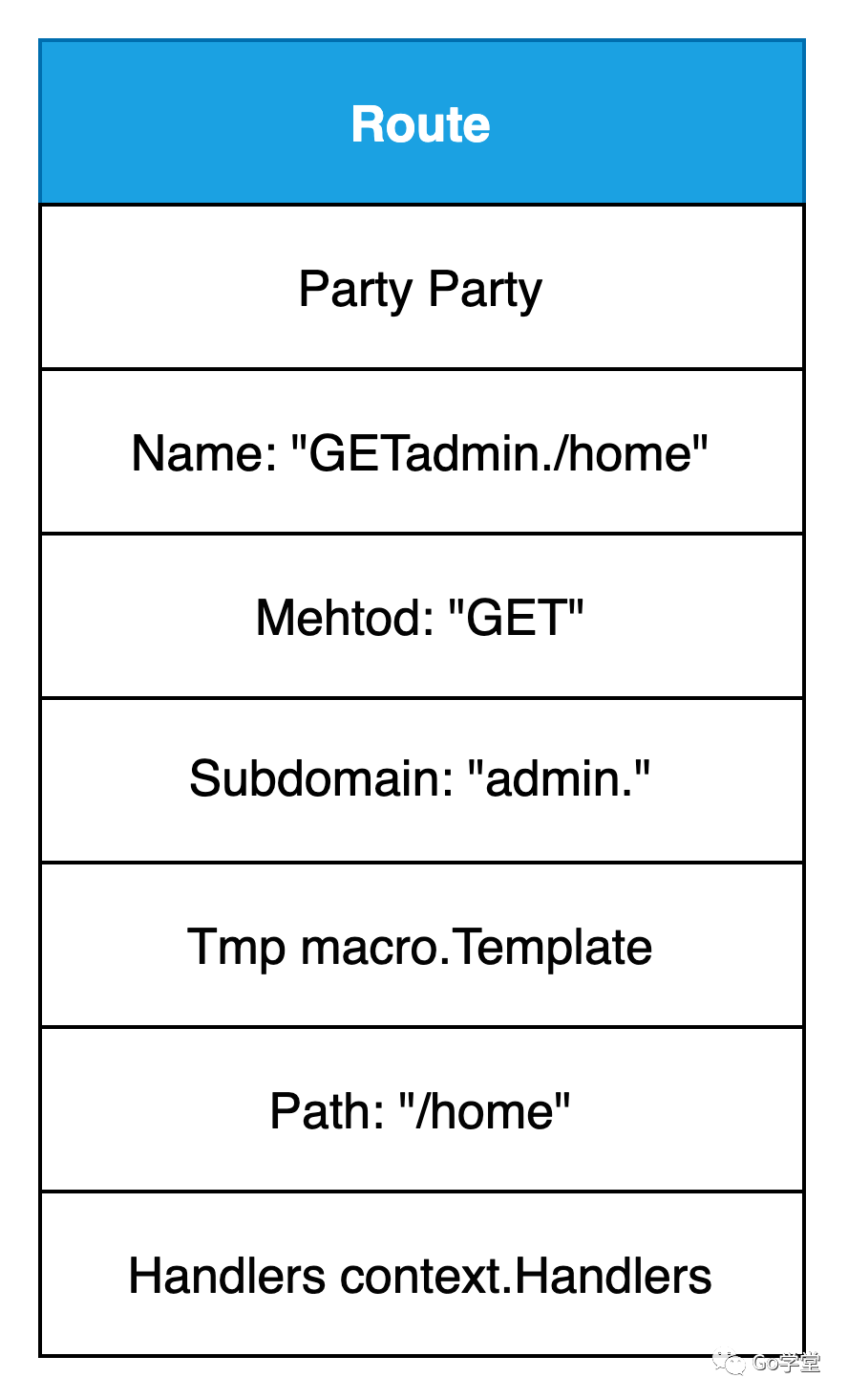 那么,adminDomain.Get("/home", Home)就是相对于子域名分组下生成的路由,其对应的Route实例如下: