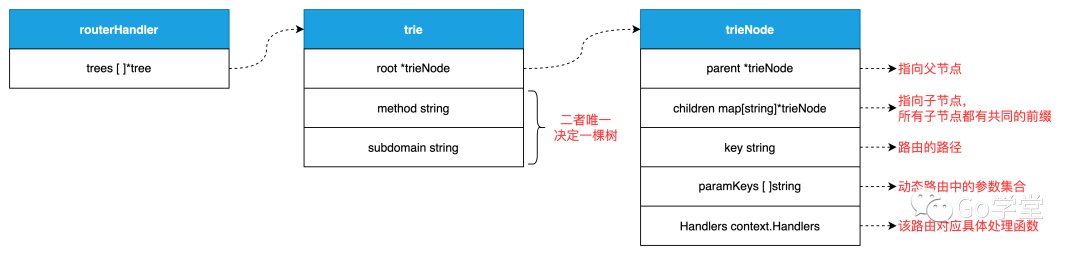 在前缀树路由结构中,子域名和请求方法唯一确定一棵树。也就是子域名相同且方法也相同,则在同一个树结构下。以下是前缀树路由表的大体数据结构及核心字段说明: