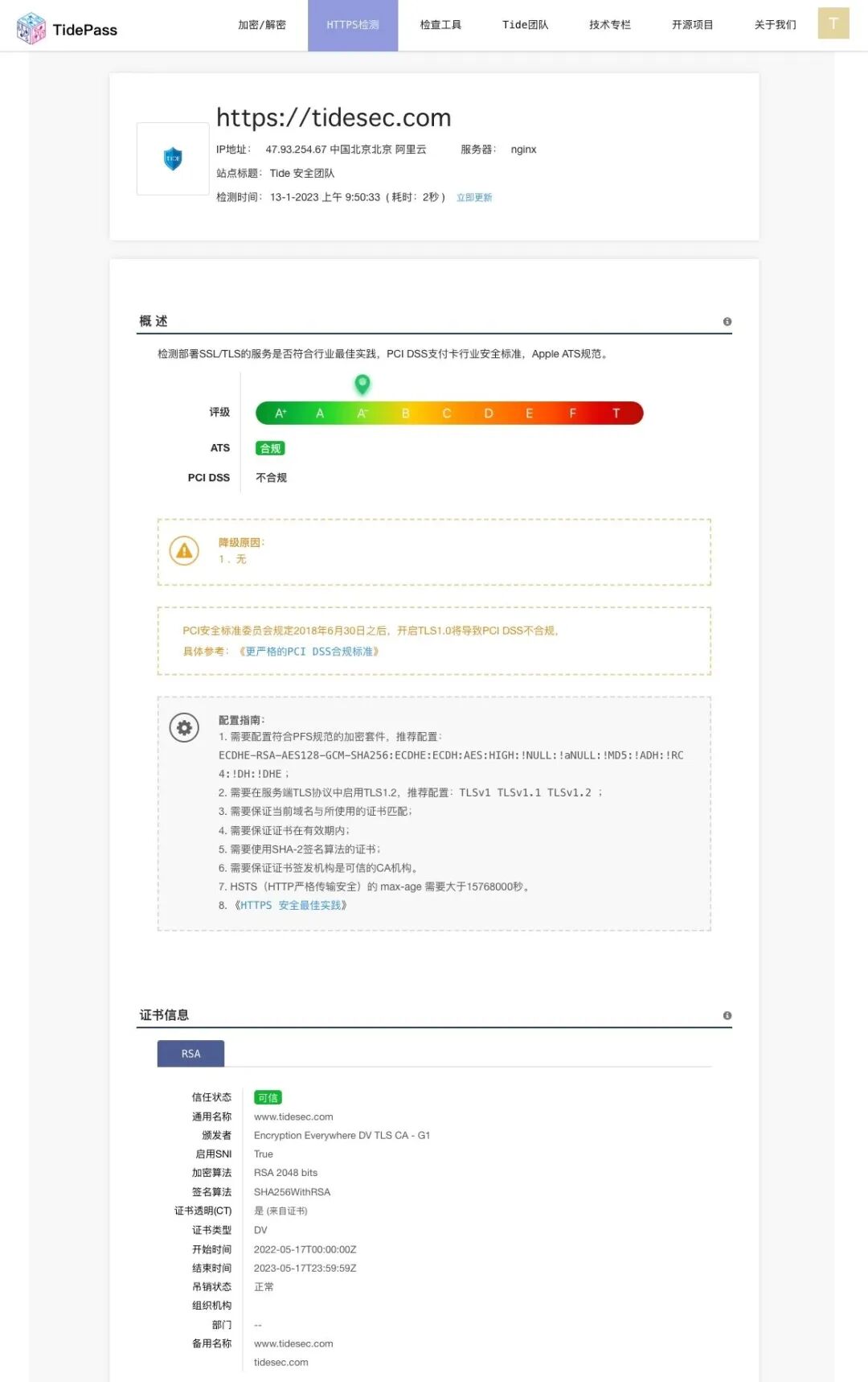 用户通过浏览器输入待检测的URL地址,可检测部署SSL/TLS的服务是否符合行业最佳实践,PCI DSS支付卡行业安全标准,Apple ATS规范。并枚举出相关域名地址、证书详细信息、证书链详细信息、当前支持协议、加密套件详细信息等。为更安全的配置和部署提供参考信息。