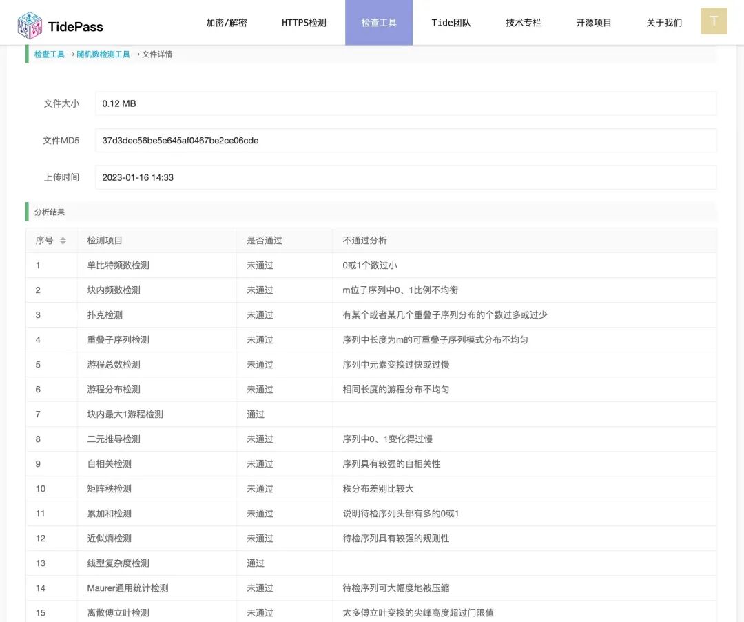 随机数检测工具是协助密评工作中对系统使用的秘钥等随机数的随机性进行检测,以GB/T32915-2016信息安全技术 二元序列随机性检测方法为依据,进行15项技术检测。