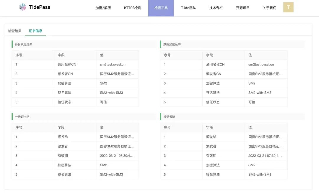 数字证书检测是协助密评工作中对系统中使用的数字证书进行合规性检测,通过对证书进行解析,分析其使用的算法,从时间、签名、证书链等多角度判断证书的有效性。