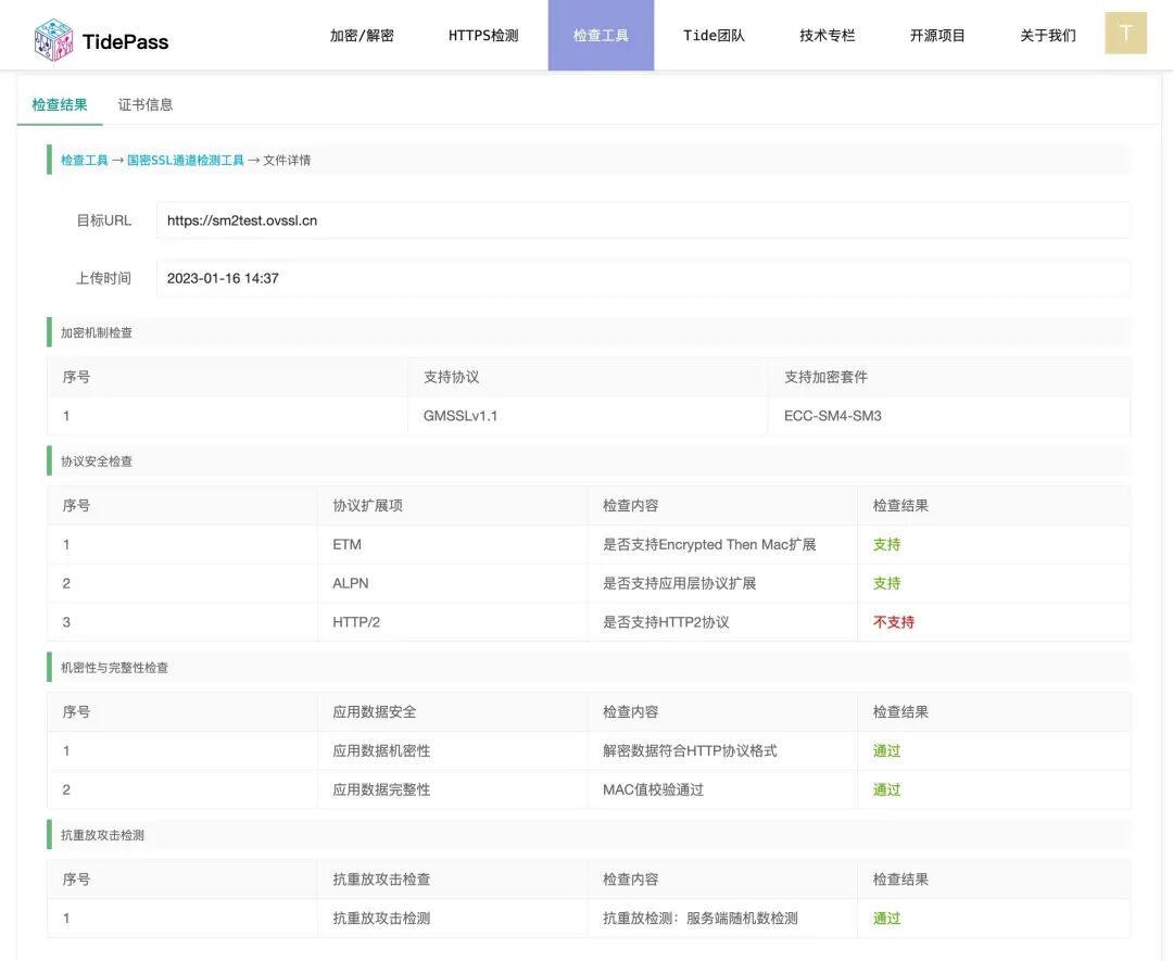 国密SSL通道检测工具包含以下检测项:协商结果,协议类型,国密算法套件,国密SSL证书有效性(证书链),抗重放攻击,通道应用数据检测功能,包含以下检测项:机密性和完整性。