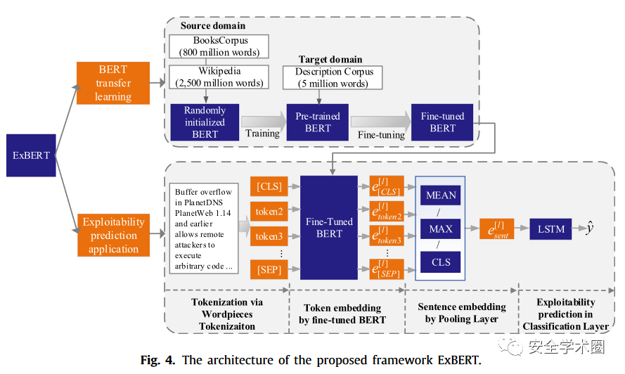 作者提出了一个基于迁移学习的预测漏洞可利用性的框架:ExBERT。该框架的特色是在微调后的BERT上增加了一个池化层用于提取综合的句子层级的语义特征,运用LSTM模型做可利用性预测的分类器。