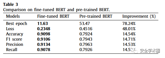在迁移学习过程中,作者首先下载了一个预训练的BERT模型:uncased BERT-base。然后选取了从1999-2019年的NVD漏洞描述做该领域的语料库。在训练后,即得到微调后的BERT。