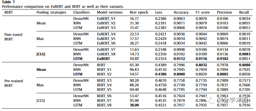 文章提出了消融实验,将ExBERT和仅预训练的BERT在token embedding的效果、是否微调、池化层的效果和分类器的效果做了对比实验。