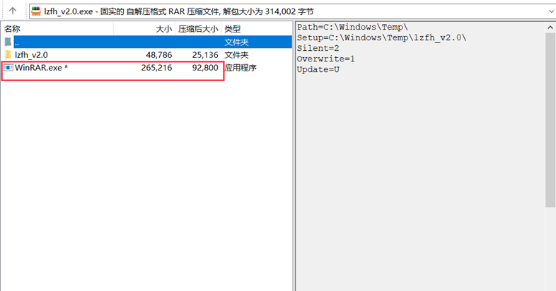 lzfh_v2.0.exe是一个带密码的自解压文件,功能为将 WinRAR.exe释放到C:\Windows\Temp目录下并运行,压缩包中的WinRAR.exe是一个木马文件。