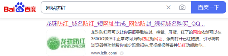 国内搜索引擎搜索“网站防红”,搜索结果中龙珠防红站点排名位于首页,推测攻击者购买了百度搜索推广排名服务。