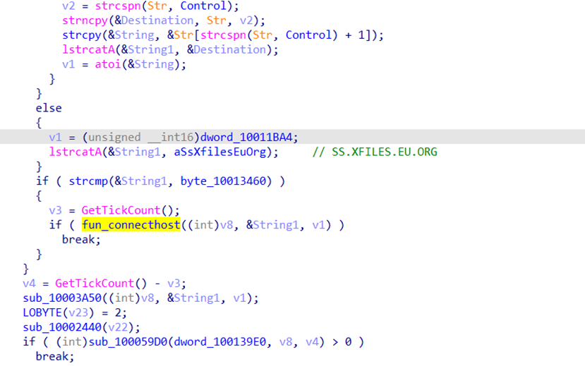通过对本地文件C:\\Windows\\Temp\\gconfig.inf的分析发现该shellcode会回连ss.xfiles.eu[.]org:88实现远程控制、键盘记录等行为,查看其字符串信息发现其远控版本为V9.5。