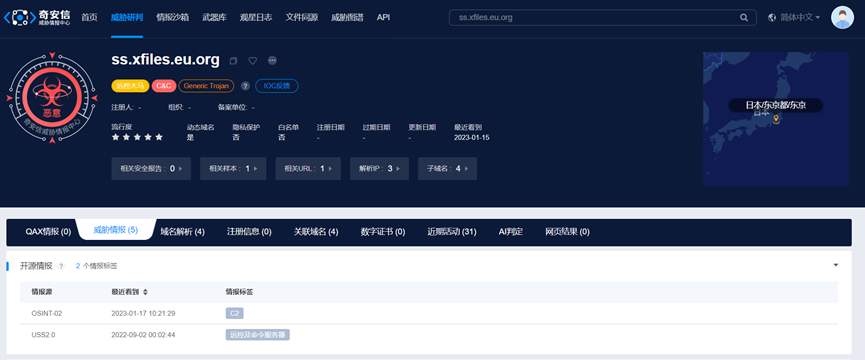 调研分析发现该木马的编译路径信息与站点Telegram客服主机浏览器信息中用户信息相同为83847;lzfh.com域名信息更新时间是2022年12月6日,与编译时间(2022-12-10)相吻合,推测攻击者准备这次攻击事件段应该是2022年12月份左右;通过奇安信威胁情报平台调研域名ss.xfiles.eu[.]org信息,发现奇安信威胁情报平台在2022年9月2日标记ss.xfiles.eu[.]org为C2,并记录其活动信息,并且根据C2活动信息推测,疑似有较大数量的主机被攻击者控制。