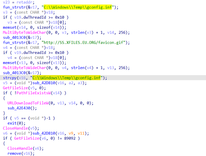 (3)请求下载hxxp://ss.xfiles.eu.org/favicon[.]gif(shellcode)该资源文件并保存到本地文件C:\\Windows\\Temp\\gconfig.inf,最后实现内存加载。