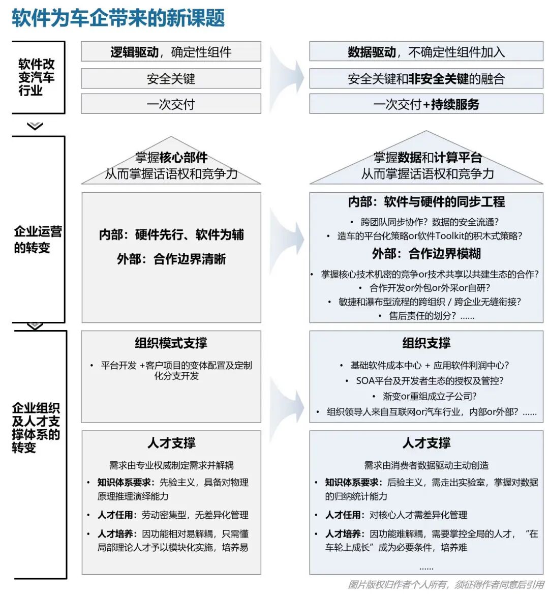 车企的话语权将不再来自机械硬件上的核心竞争力,而将来自“数据”和“计算平台”两个方面。这对于企业的运营带来了两方面挑战:对内部而言,原先围绕看得见摸得着的硬件技术开发的模式已经意义不大。为了提升开发效率,车企更愿意采用软硬件同步工程模式,围绕着某一需求,以数据和计算平台为媒介,将解耦后的软硬件并行开发。软硬件开发团队如何同步协作?如何确保数据在满足信息安全前提下通畅地在组织内/跨组织流通?软件和硬件的平台化策略该如何兼容,是仍然基于造车平台,还是走向诸如大众的Toolkit模式实现积木式的模块化变体管理?这些都对车企提出新的挑战。对外部而言,传统的制造商、一级供应商、二级供应商之间的合作模式将被打破,为原有的竞合关系带来了极大的不可预测性。车企应该掌握核心技术并保密以谋求垄断,还是将技术共享以谋求共建生态合作?哪些业务可以合作开发,或外包开发或外采或自行开发?位于不同层面上的企业,尤其是采用瀑布流程及敏捷流程的企业在合作时如何无缝衔接?利润如何划分?售后的责任如何划分?这些问题都将是企业间反复拉锯和思考的。新的运营模式也将必须由新的组织及人才模式来承接,挑战依然众多。从组织上看,软件数量增多后的汽车研发组织该以客户差异为导向还是以平台为导向来构建?是按照产品线进行盈利核算,还是按照AUTOSAR架构的理念、将组织划分为基础软件的成本中心和应用软件的产品利润中心?对于SOA平台和跨企业内外的开发者生态该如何有机授权及管控?组织改革的实施是渐变的还是重构(例如成立可拆分上市的单独软件公司)?组织的领导人应来自传统汽车行业还是IT行业,该内部提拔还是外部空降?这些都将关系到企业转变的效果和实施成本。首先是用人标准的转变。传统的“由专业人士制定需求再逐级分解实施”的开发模式是先验主义的,每位工程师只需应对局部知识,对其能力要求往往是诸如热力学、轮胎动力学、机械原理等经典知识体系,设计方式是基于原理的演绎、推理。而“软件定义汽车”则将在很大程度上打破这种规则,企业将更多地直接从需求程度各异、性格各异的消费者群体获取相应数据,主动引领并创造需求。这种开发模式是经验(后验)主义的,对工程师的能力要求是统计学、人因工程学等知识。研发人员不能再钻逻辑的牛角尖,而应该走出办公室,善用数据的归纳总结得到结论。其次,对用人单位而言,将面临具备架构思维的人才极度缺失的窘境。只见个别“树木”、不见整体“森林”的问题突出。在面对新时代更复杂的汽车软件架构时,这种缺失不仅会降低开发效率,也会导致在设计中缺少对功能的全盘考量,待需求拓展后引发严重的技术负债风险。然而在汽车行业培养一位具备顶层设计思维的工程师并不容易。他不仅需要在面对自动驾驶等自身尚未成熟的技术应用时掌握相当的基础科学知识;同时还需要对汽车越来越异质化却难以再按物理原理换分边界的功能有全面的了解,有时甚至还需要辅以一些所谓的“直觉”。从实战来看,这种“直觉”对汽车工程师格外重要,但却无法在书本中习得,势必需要从小耳闻目染地坐车、开车,通过数以百万计公里的出行旅程中与车辆的“交流”,去观察、去体验、去热爱才能建立。驾驶经验匮乏却能成为优秀的系统工程师、乃至标定工程师的日子将一去不复返。另外对于企业,原来在薪酬体系及关键绩效指标上展现出的劳动密集型产业特征也要做出改变,原本靠平台吸引力和优秀的培训体系,大企业面对人才流失并不在意,美其名曰“黄埔军校”。但未来面对稀缺的顶层架构人才,企业恐再无糟蹋人才的资本,必须对他们予以差异化的选用育留考量。推荐阅读