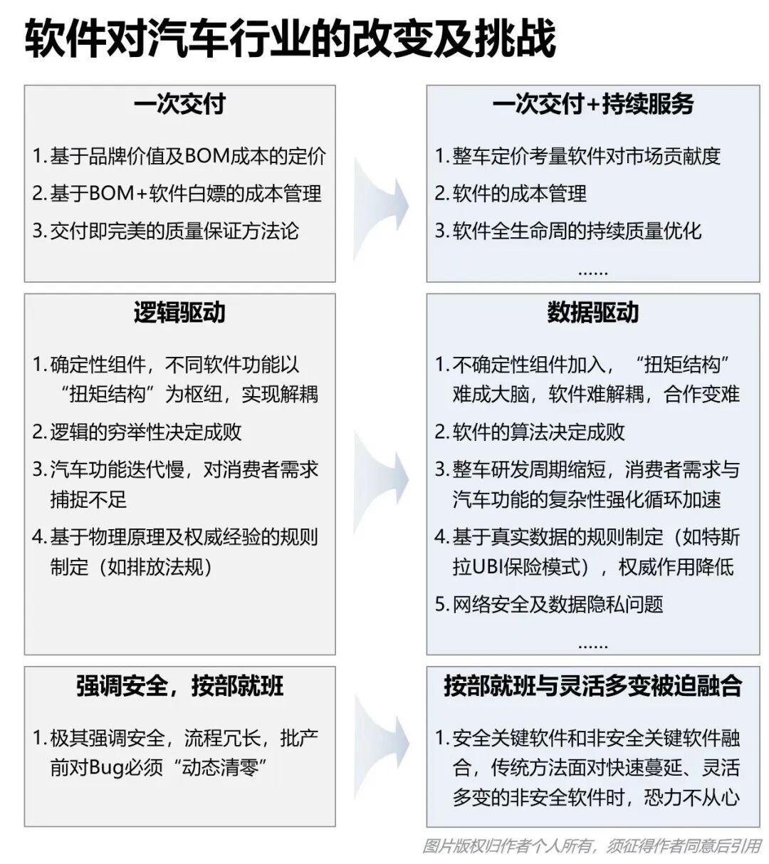 改变一:汽车从一次性交付转变为持续服务,从而改变了汽车的产供研模式和汽车行业的思维方式依靠OTA持续升级的软件、二次付费软件、订阅服务的出现,让汽车不再仅是一次性交付的产品,还需要在车辆全生命周期内提供持续服务。车辆的价值也不仅依赖于看得到、BOM明确的机械装置,还包含了隐形的、价值增值的、持续性盈利的软件服务上。于销售端,这将改变汽车产品的售价模式,如何评估软件的价值,量化其市场贡献度,将成为全新的挑战。于供应端,这将影响车企的原有基于BOM+软件白嫖的成本管理模式;于研发端,这将影响传统车企的质量保证方法论。同时,一次交付向持续服务的转变也将一定程度上改变汽车行业的基因。原先的汽车行业以劳动密集型制造业为主要特征,解决就业人口问题是国家赋予它的重要使命,而就业质量则被长期忽视。随着软件的流行,汽车行业将具备一部分知识密集型服务业的属性,这对行业的工作开展方式及思维提出了新要求。 改变二:汽车从逻辑驱动转化为数据驱动,从而带来一系列巨大的挑战数字化、智能化时代背景下出现的AI等新技术、新算法通过软件与汽车融合,推动了一系列依赖于状态估计和主动决策的功能出现。这些功能的“血管”不再是非黑即白的逻辑,而是数据。这将带来多方面的挑战:数据驱数据驱动为汽车首次引入了非确定性(non-deterministic)组件,将传统的车辆驾控模型和非确定性概率估计模型在汽车软件中有机结合成为了新挑战。仅靠if else逻辑枚举法实现的劳动密集型代码开发方式将难以成为衡量软件成败的关键。同时,原先整车控制所共同遵循、可用于将软件需求清晰分解到不同控制器的“扭矩结构”将难以再发挥“大脑”的作用,这就意味着软件架构的圈复杂度将大幅提升,功能间解耦愈发困难,软件开发的合作边界将变得模糊,对开发效率及质量挑战极大。