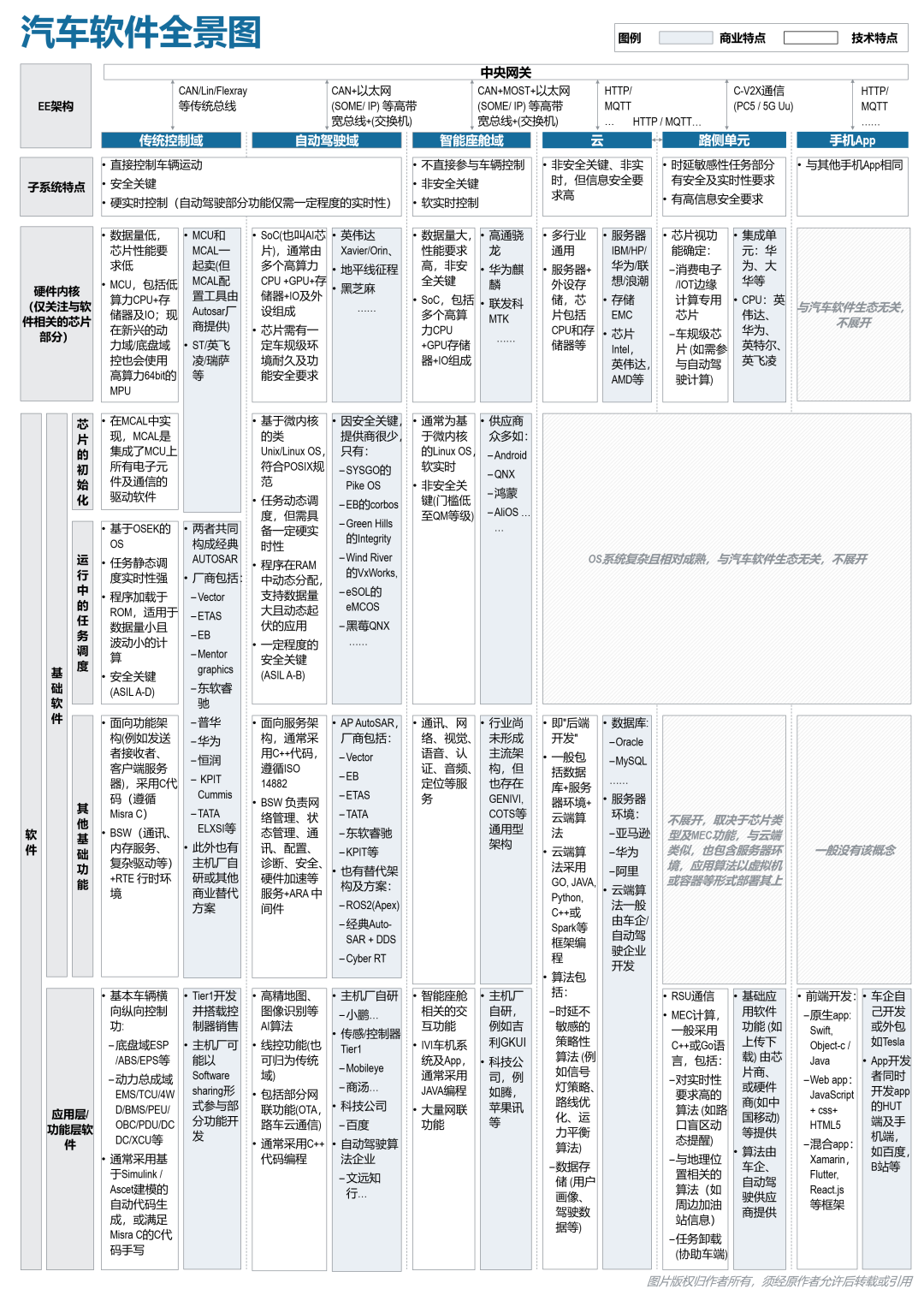 必须说明,这种分类并不唯一,这里只是为了将汽车软件拆分为互斥穷举的若干部分,便于分析。如下图所示,笔者将不同域的软件技术和商业特点进行了简要总结,如下图(后台回复“AES14”可获取高清版)。![]()