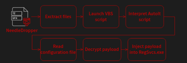 近日,研究报告显示,NeedleDropper是一个自解压文档,其中包含修改后的AutoIt解释器、混淆的AutoIt脚本和用于初始执行的Visual Basic脚本。这些文件共同创建恶意执行过程,提取文件以解密和注入恶意代码。同时,该恶意软件还会分发多个未使用的无效文件来隐藏自己,通过将重要数据存储在数MB不重要的数据之间,并利用合法应用来实现执行。