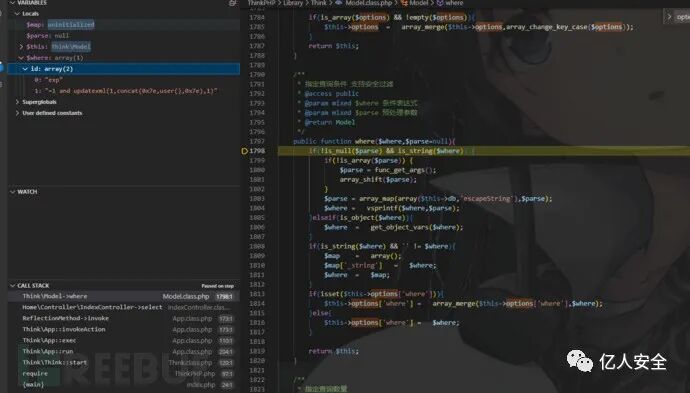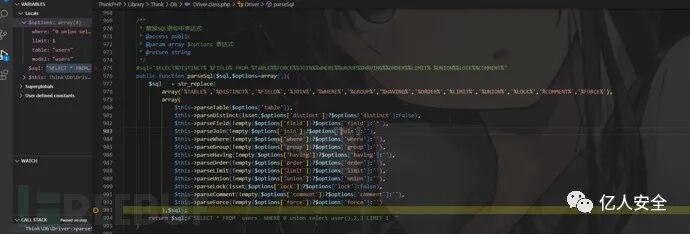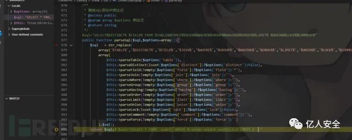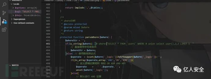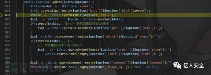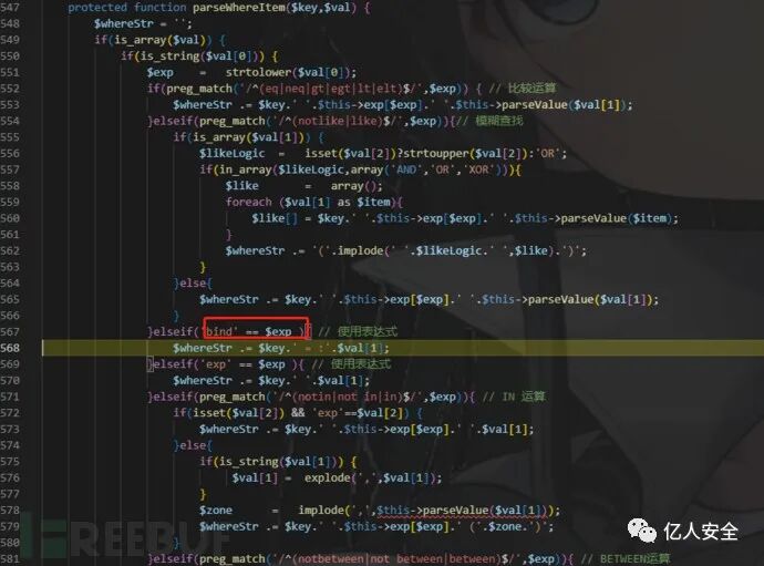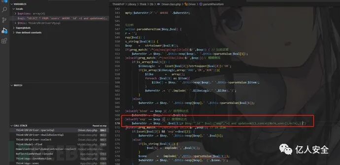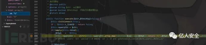 这里可以看出当$exp=bind时,$whereStr是可控的,而后得到拼接后的语句,此时的SQL